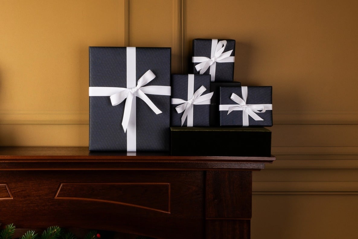 Machen Sie das Schenken zu einem besonderen Erlebnis mit unserer maßgeschneiderten, luxuriösen Geschenkverpackung. Wir verpacken Ihre Geschenke sorgfältig in elegantes marineblaues Papier, verziert mit einem hübschen Ripsband, und fügen auf Wunsch eine persönliche Nachricht von Ihnen hinzu.
