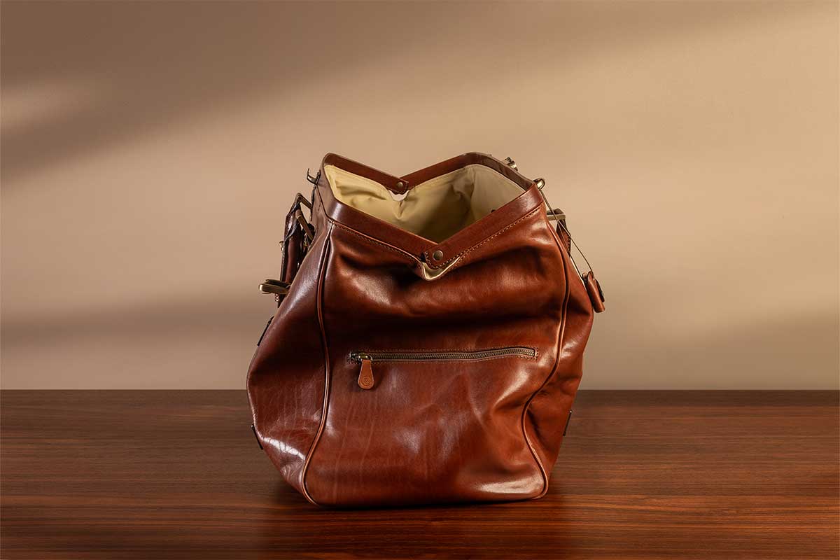 Diese Tasche verfügt über eine traditionelle Rahmenöffnung, die einen mühelosen Zugriff auf Ihre Habseligkeiten ermöglicht. Die breite Öffnung ist typisch für das klassische Gladstone-Design. Mit einem großzügigen Fassungsvermögen von 44 Litern (Gassano M) oder 66 Litern (Gassano L) ist diese luxuriöse Reisetasche perfekt für ein langes Wochenende oder eine Woche Urlaub.